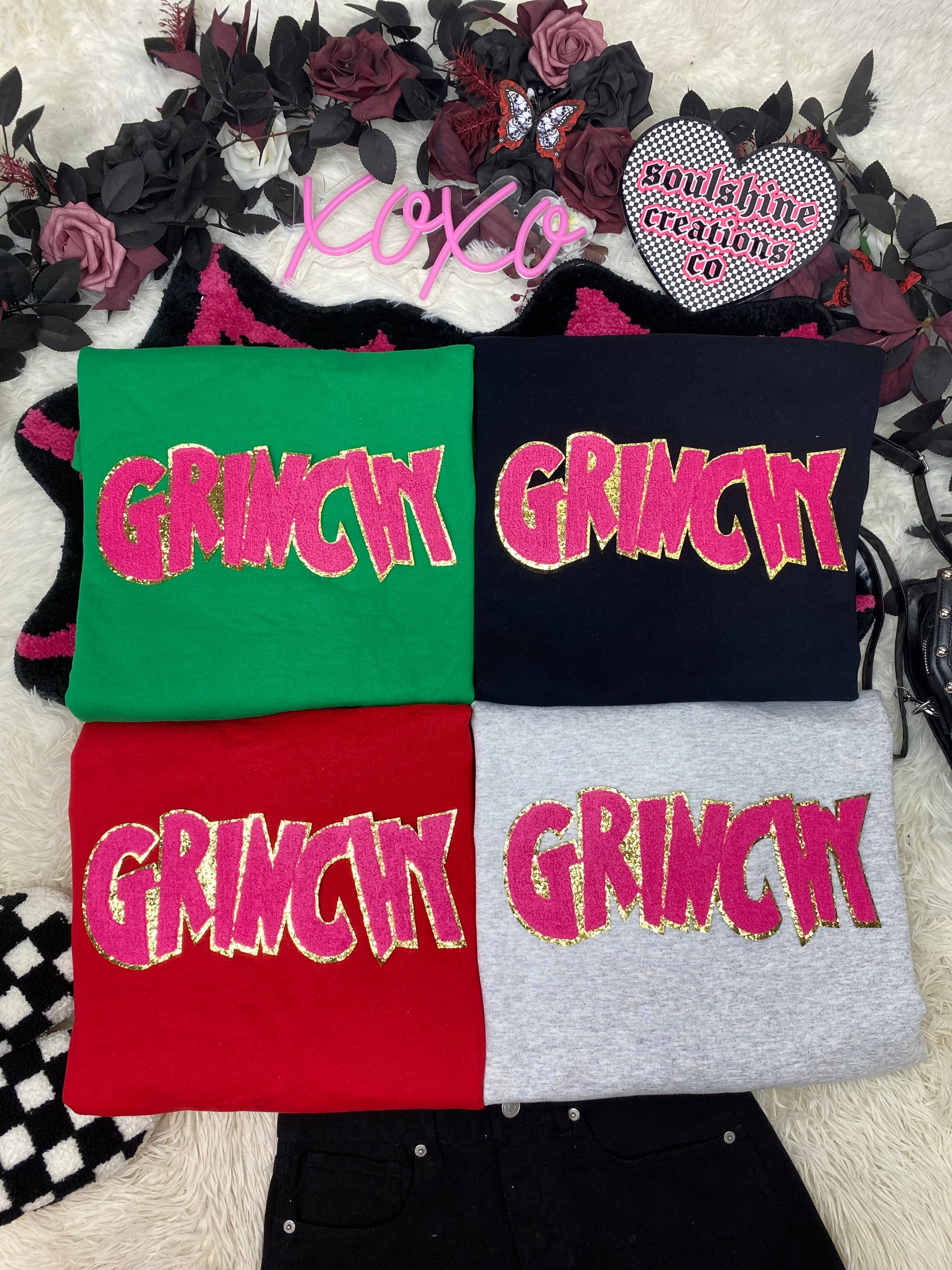 grinchy pink chenille patch christmas tee or sweater