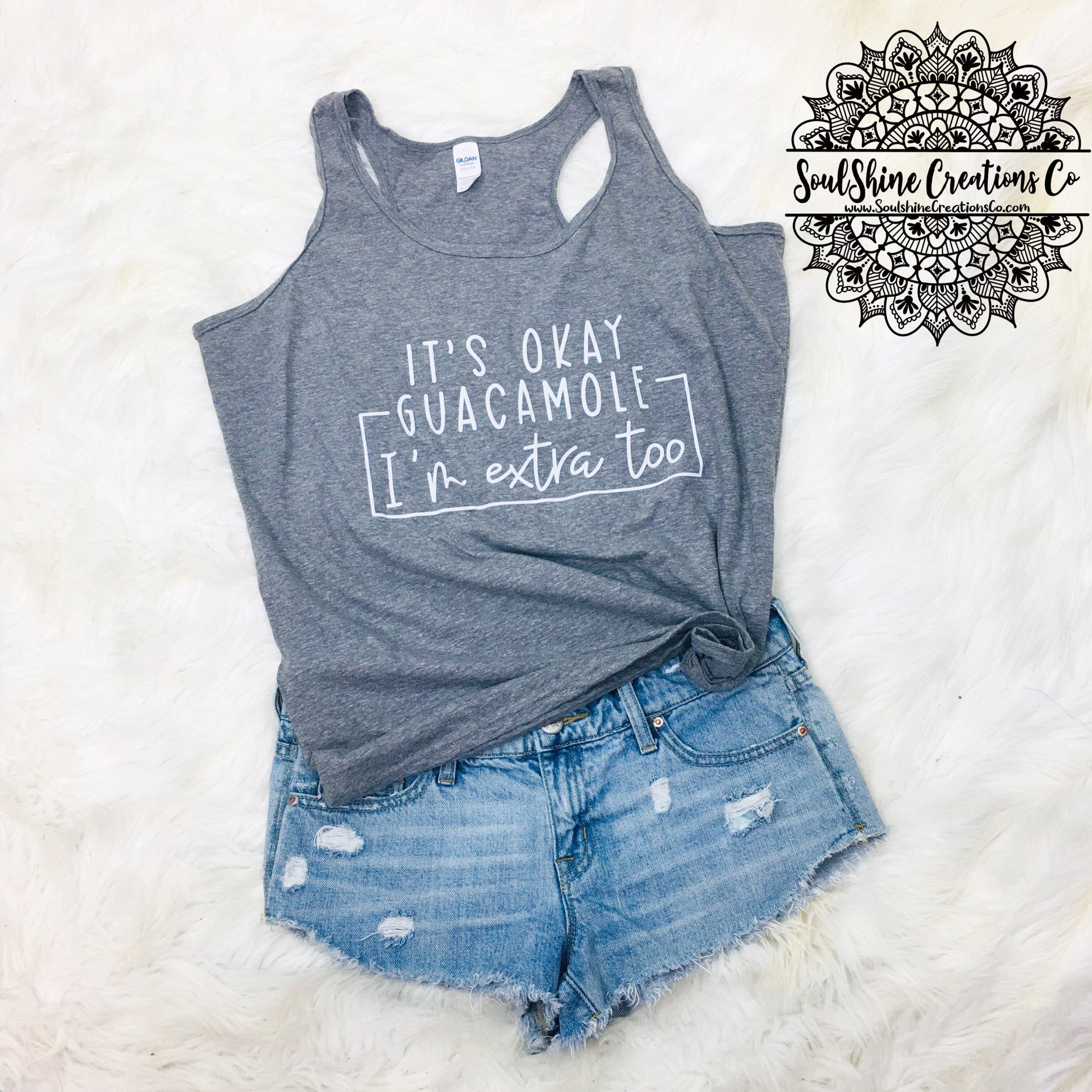 Its Okay Guacamole I’m Extra Too Racerback Tank Top- (Color of shirt in photo is Heather Gray, for reference)