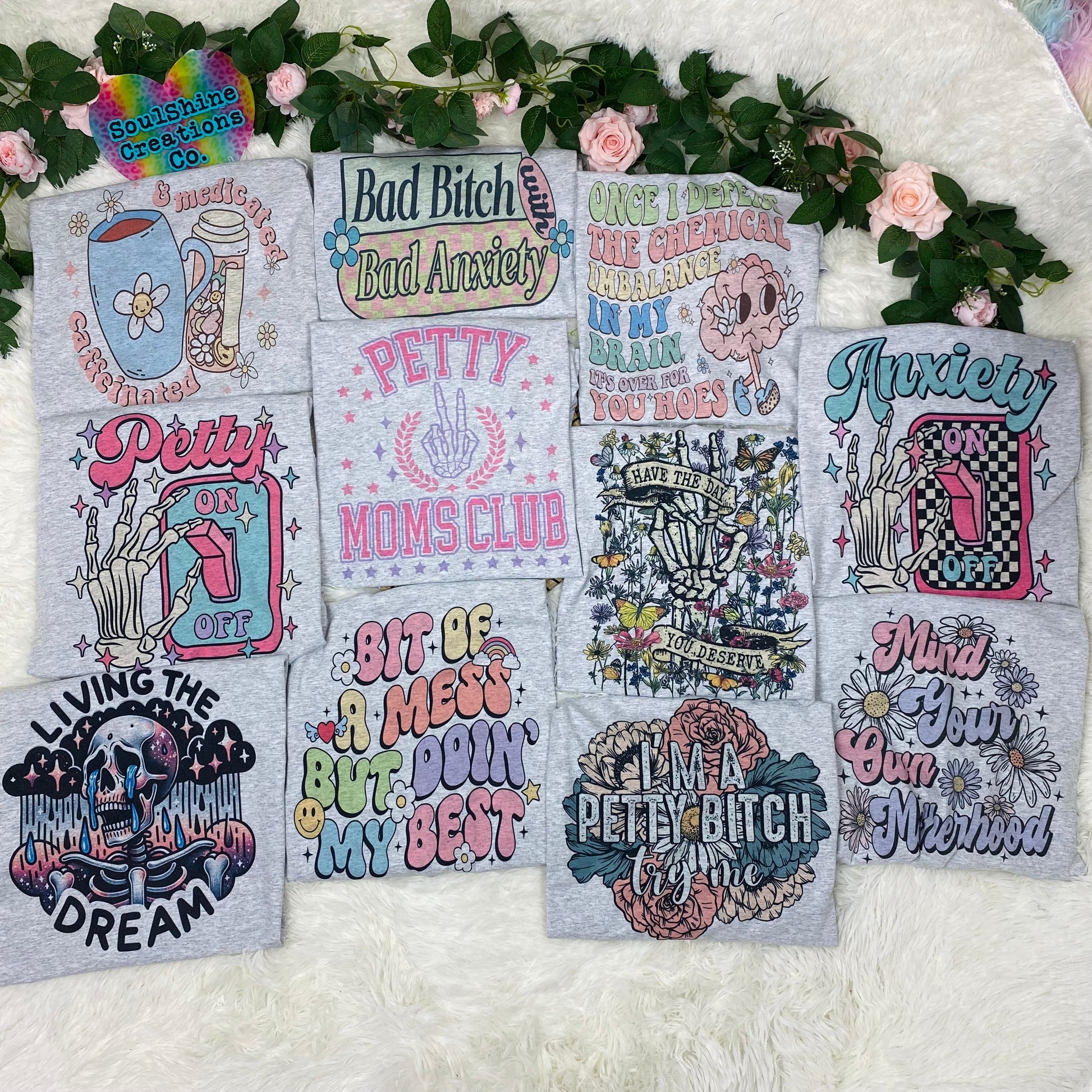 PLEASE NOTE, Some themes may have profanity, so if you choose a theme that has it, but you really don’t want any cuss words in your design, or if you really do want them, please just leave me a note! & If you have a specific design you want, leave me a note in your order, & I will try my best to accommodate you! All that being said, Please remember it is a mystery tee bundle!